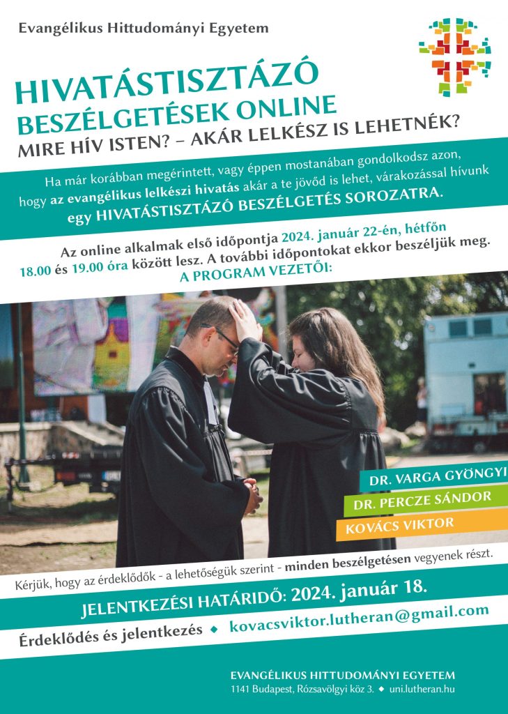 Hivatástisztázó online beszélgetés sorozat 2024.01.13. Középiskolások figyelmébe ajánljuk! Hivatástisztázó beszélgetések Bejegyzés navigáció Previous Previous post: JELENTKEZÉS AZ EVANGÉLIKUS HITTUDOMÁNYI EGYETEMRE – 2024 szeptemberében induló képzéseireNext Next post: Gyermek és ifjúsági programok 2024