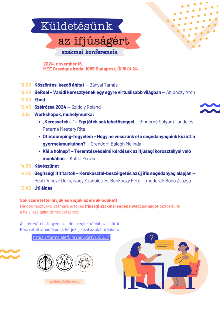 A Magyarországi Evangélikus Egyház Gyermek- és Ifjúsági Bizottsága és Gyülekezeti és Missziói Osztálya közös szervezésű szakmai konferenciát rendez a gyermek- és ifjúsági munkában szolgáló gyülekezeti munkatársak, hitoktatók és lelkészek számára.