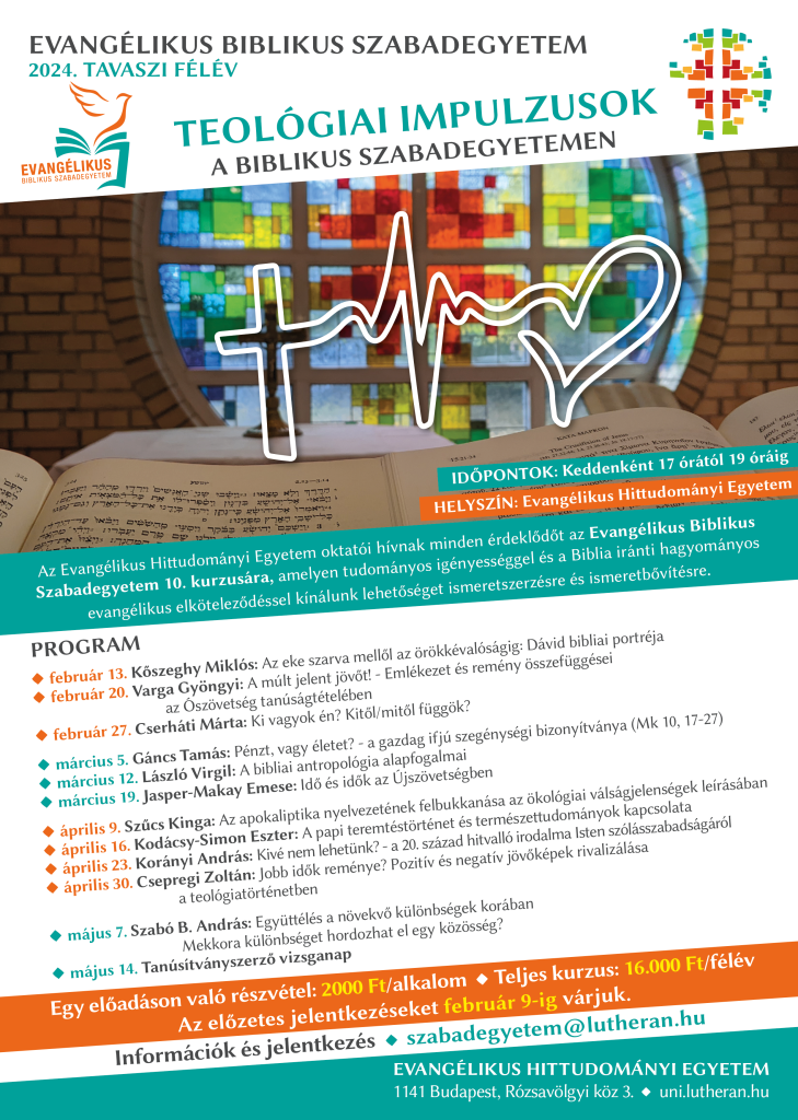Az Evangélikus Hittudományi Egyetem oktai hívnak minden érdeklődőt az Evangélikus Biblikus Szabadegyetem 10. alkalmára, amelyen tudományos igényességgel és a Biblia iránti hagyományos evangélikus elköteleződéssel kínálunk lehetőséget az ismeretszerzésre és ismeretbővítésre.